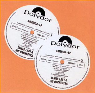 The America Album 09.11.2012 01. Evie (Webb) 02. America (James Last) 03. Jean (McKuen) 04. Wedding Bell Blues (Nyro) 05. Sunshine Of Your Love (James Last) 06. Tracy (Vance/Pockriss) 07. Lay Lady Lay (Dylan) 08. Fahrt ans Meer (James Last) 09. Is That All There Is (Leiber/Stoller) 10. Zwischen Tag und Nacht (James Last) 11. Ballad Of The Easy Rider (McGuinn) 02/09: weltweite Erstveröffentlichungen 01/03/11: zum Teil gekürzte Versionen erstmals veröffentlicht auf der LP „With Compliments“ 04: erstmals veröffentlicht auf der USA-LP „Soft Rock“ 07: erstmals veröffentlicht auf der Kanada-LP „Music From Across The Way“ 05/06: gekürzte Versionen erstmals veröffentlicht auf der LP „Golden Non Stop Dancing 10“ 08: erstmals veröffentlicht auf der LP „Wenn süß das Mondlicht auf den Hügeln schläft“ 10: erstmals veröffentlicht auf der LP „Russland zwischen Tag und Nacht“ Deutschland – Muster-LP 2808 001 Deutschland - CD Deutschland – CD 06025 3718130 |